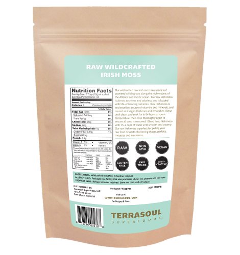 -. Feature : Terrasoul Superfoods Irish Moss, 12-ounce Pouch / Wildcrafted, Non-GMO, Raw, Gluten-Free, Vegan / Irish Moss is a seaweed that comes fresh from the ocean and possesses many healing properties and an impressive nutritional content / Irish Moss contains 15 elements essential to the human body, and is packed with calcium, iodine, potassium, Vitamins A, D, E and K / A wonderful vegan substitute for gelatin in recipes