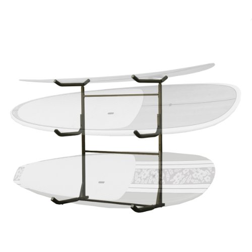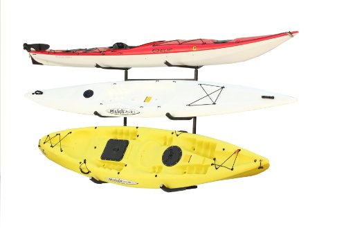 The Stoneman Sports KC-123 Catalina Plus Freestanding Triple Kayak or Canoe Storage Rack has a 250-pound maximum weight capacity and is a convenient storage solution for any style of kayak or canoe. The KC-123 has a space saving design allowing it to fit right against a wall for easy storage. Constructed of durable steel with a black finish, this unit stores a maximum of (3) kayaks off the ground and out of the way. The KC-123 can be used in all weather conditions for indoor and outdoor use and features an exclusive flat top cradle design for larger canoes or kayaks. The heavy-duty rack fit kayaks and canoes with a length up to 20-feet and a hull size up to 36-inches wide and 18-inches deep. The Stoneman Sports KC-123 can help you safely transport your canoes and kayaks to and from your car with the addition of the G-C4 Caster Wheels (sold separately). The top level can be used as a work stand, repair platform or a storage space for paddles and other accessories. This unit is quick to assemble with no drilling into walls or ceilings. The Stoneman Sports KC-123 Catalina Plus Freestanding Triple Kayak or Canoe Storage Rack comes with a 1-year limited manufacturer's warranty to protect against defects in material and workmanship. Stoneman Sports is dedicated to innovation and simplicity and specializes in high-quality lifestyle and sports products. Their expansive product offering includes bike racks, kayak carriers, grilling accessories and much more.Feature