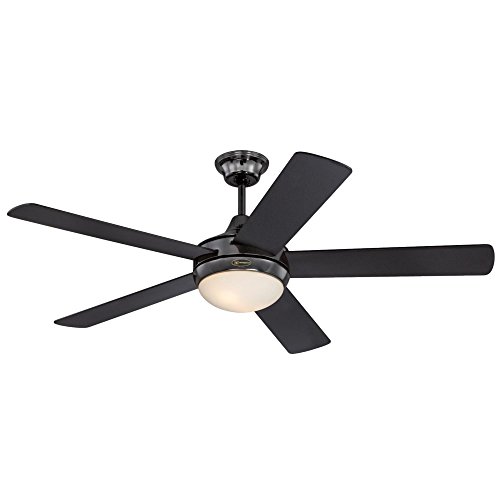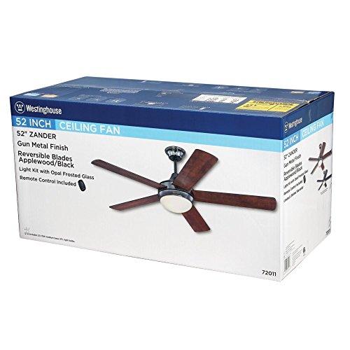 Add a transitional touch to any room with the Westinghouse Zander Two-Light 52-Inch Reversible Five-Blade Indoor Ceiling Fan. With a gun metal finish on the motor and blade brackets, reversible applewood/black blades and an opal frosted glass light fixture, this fan will complement the decor of any room. Designed for rooms up to 360 square feet (18 by 20 feet), the Zander utilizes a 153-by-17-millimeter silicon steel motor with triple capacitor for powerful, quiet air circulation. Three fan speeds (high/medium/low) and a reversible switch to help keep you comfortable. In warm weather, you can run the fan counterclockwise to stay cooler. In the winter, you can run it clockwise to recirculate warm air from the ceiling, eliminating cold spots and drafts. The fan provides airflow at up to 4,690 cubic feet per minute (cfm). It is rated to operate at 56 watts at high speed (without the lights), which gives it an airflow efficiency rating of 82 cfm per watt. (As a comparison, 49-inch to 60-inch ceiling fans have airflow efficiencies ranging from approximately 51 to 176 cfm per watt at high speed.) The Zander is backed by a lifetime motor warranty and a two-year warranty on all other parts. Product reference number 72011.Feature