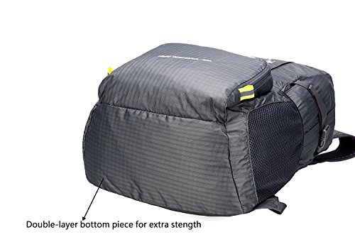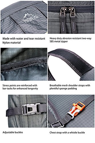 -. Feature : Durable and Comfortable: Made of high quality thicken nylon fabric. This handy backpack features extra strength and long-lasting performance with the lightest weight possible. The extra strength provided by the double-layer bottom piece makes it very convenient to carry more load on your journeys. Heavy duty two-way SBS metal zippers across the backpack are convenient to operation on whichever side you prefer. Longevity is further enhanced by bar-tacks at major stress points. / Lightweight (0.7 LB) and Roomy (35 Litre): This travel backpack is ultralight with only 0.7 lb, but it is roomy. Separators in the main compartment can hold a 13 inches laptop with spare space. 2 side mesh pockets can even hold a 40z water bottle. 2 front pockets meet the request of organized elites. Multi compartments to keep things organized. / Compact and Portable: A true space saver. Folding the backpack into its own pocket for storage(no more excess baggage fees) and unfold it when you reach destination. To avoid overweight charge, simply unfold from your checked bags and use it as a carry on for your excess baggage. / Comfortable and Secure: Widen S-shaped shoulder straps distribute shoulder and back bearing stress evenly. Breathable mesh shoulder straps with plentiful sponge padding also help relieve the stress from your shoulder. The length of the shoulder straps is adjustable. The chest strap with a whistle buckle help you lock your backpack in place securely. / Lifetime Guarantee: Venture Pal has bent over backward to put your needs first. With thousands of options available, you are making a very intelligent decision purchasing travel backpack with us. We'll promise to provide you with the finest product and service around, or your money back, no question asked! Add your packable backpack to your Cart, and enjoy your outdoor activity with the backpack!
