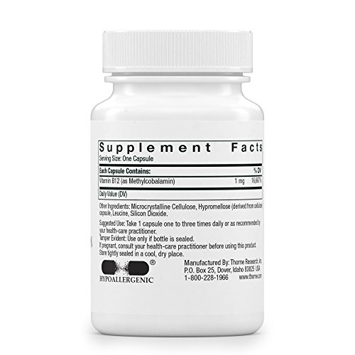 -. Binding : Health and Beauty -. Brand : Thorne Research -. Feature : * made without flowing agents that can inhibit bioavailability / * without preservatives, magnesium stearate, or other lubricants and diluents / * supports cardiovascular health, nerve function, and sleep* / * an active form of vitamin B12 more readily used by the body* -. Label : Thorne Research -. Manufacturer : Thorne Research -. MPN : B125 -. PartNumber : B125 -. ProductGroup : Health and Beauty -. ProductTypeName : HEALTH_PERSONAL_CARE -. Publisher : Thorne Research -. Studio : Thorne Research -. Title : THORNE RESEARCH - Methylcobalamin - 60's [Misc.] [Health and Beauty]