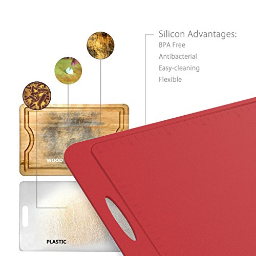 Product Description Color:Red The Secret To Choosing the Perfect Silicone Pastry Brush is Innovative Design & Quality Materials. Silicone's are safe, made from silicon found in common sand and oxygen molecules,excellent insulator; it can tolerate a huge range of temperatures. Each of our utensils is designed to meet the needs of chefs and bakers and manufactured to the highest standards using only the best materials. Special Design: √100% FDA Grade, BPA Free Silicone coated cooking utensil set √Large enough to do more food preparation quicker, thickness about 0.3" √The silicone board bends nicely to allow the chopped item to be poured into a pot or bow √Flexible Nonslip Antimicrobial Thick Heat Resistant √Easy to clean without residue, can be placed in the dishwasher cleaning, and its convenience √The sides of the silicone cutting board have slots and measuring scales that allow you to design the size of the food and collect the juice that flows out √EXVI products for all customers to provide 18 months of quality warranty, a greater degree of assurance to each customer's consumer experience Our Silicone Products Package Contains: 1 x Cutting Board(15.75 inch x 9.75 inch x 0.3 inch ,Red):Cut fruits, cut vegetables, making a variety of food Lifetime Guarantee against defects in materials or workmanship. Click the Add to Cart Button at the Top of this Page to Order Your Set NowFeature