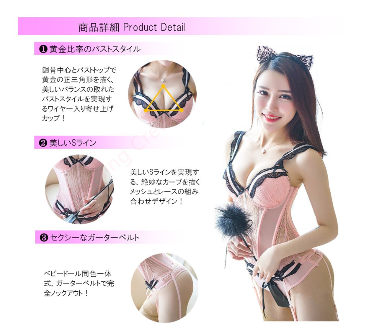 ■商品名ハイレグ レオタード セクシー コスプレ 猫 なりきり 衣装 コスチューム セクシー下着 勝負下着 ランジェリー テディ セクシーランジェリー エロ レース 下着 通販☆シースルー キャミソール ガードル ガーター オールインワン■セット内容ガーターベルト付きベビードール Tバック 猫耳カチューシャ レースニーハイストッキング 羽毛ワンド 猫コスチューム 5点セット!■規格 FM-8734-5レディースフリーサイズ(S~Lサイズ相当)カラー:ピンク/ホワイト ナイロン85%/スパンデックス15%☆ワイヤー入りブラカップで美しいバストラインを実現、寄せ上げ効果も期待できます!☆多段3列背面フック、伸縮性のある生地、長さ調節可能な肩紐で広い範囲の様々な体形の方にフィットします!※ベビードールやセクシーランジェリーなどの下着類やコスプレなどは商品名を伏せて発送させていただきます。※スク水 スクール水着 レオタード 衣装などコスプレ 衣装、コスチューム 衣装を激安で販売!ハロウィン コスプレ・ハロウィン 仮装・ハロウィン 衣装などバリエーション豊富、学園祭 文化祭のコスプレ 衣装やコスチューム 衣装なら当店におまかせ下さい!