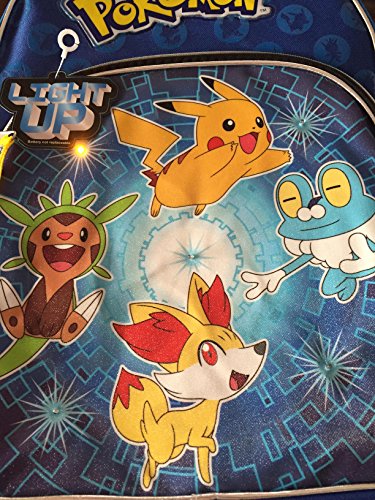 -. Brand : Pokémon -. Color : blue, red, white, yellow, multi -. Department : boys -. EAN : 0647409150778 -. Feature : Full size standard backpack (16"H x 12"W x 5"D) / Flashing lights rotate with movement / Large main compartment for school books, iPad or accessories / Padded adjustable shoulder straps for comfort fit / Mesh side pockets for water bottle or school supplies -. Model : KAA23584248LP -. PackageQuantity : 1 -. ProductGroup : Apparel -. ProductTypeName : LAGE -. Size : 16" -. Title : Pokemon 16" Leaping Pikachu Light Up Kids Backpack - Blue -. UPC : 647409150778