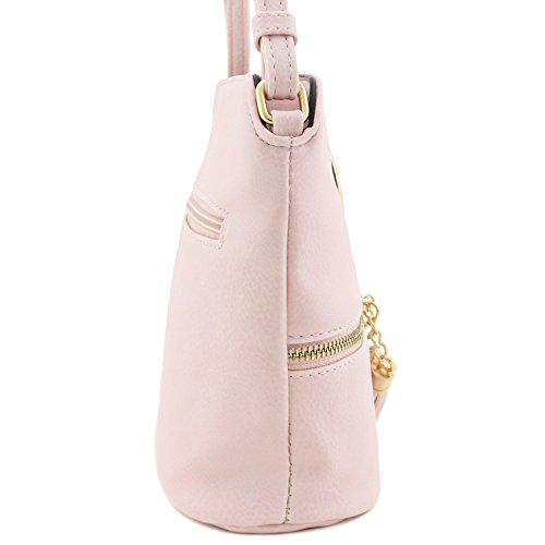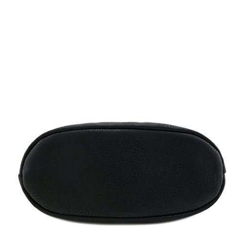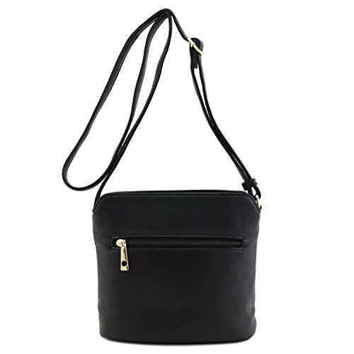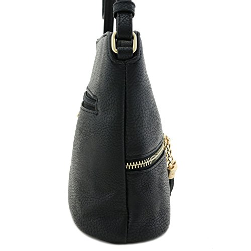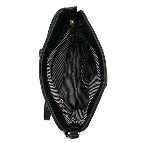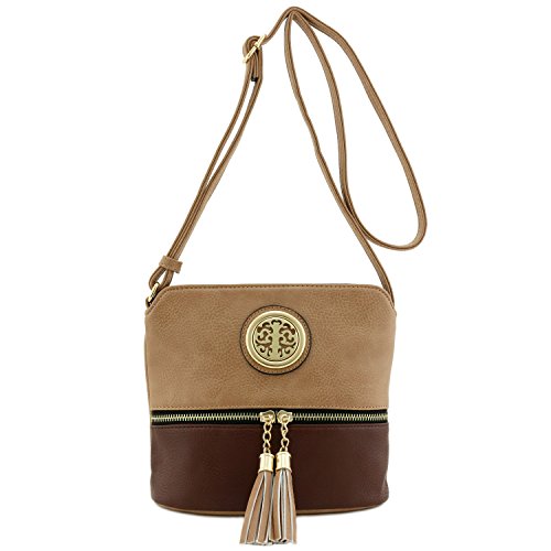 -. Brand : Deluxity -. Department : womens -. Feature : 8.75" (W) x 7.5" (H) x 3.5" (D) / NOTE: front zipper is a décor, not a functional pocket / Adjustable shoulder strap with 25" drop / Faux leather & gold tone hardware / 1 zipper pocket & 1 open pocket inside -. ProductGroup : Shoes -. ProductTypeName : HANDBAG -. Size : One Size -. Title : Tassel Accent Small Crossbody Bag with Emblem