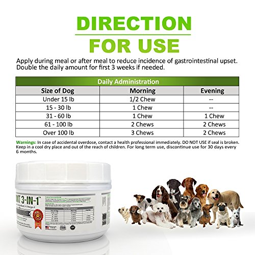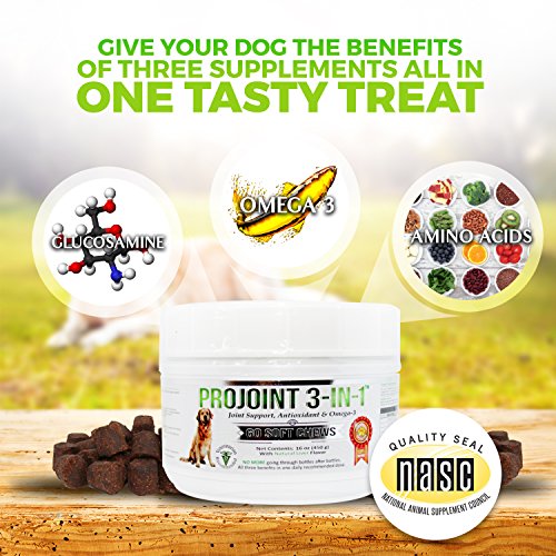 ALL IN ONE GLUCOSAMINE, OMEGA 3 & ANTIOXIDANTS: Nutri-Q USA Projoint's 3-in-1 dog supplements gives your dog the benefits of three supplements, all in one tasty treat so that you don't have to chase your dog with 3 separate supplements! This yummy chewable supplement keeps your dog mobile by supporting healthy joints, boosts immunity with antioxidants, and supports a healthy heart and brain with Omega 3s.