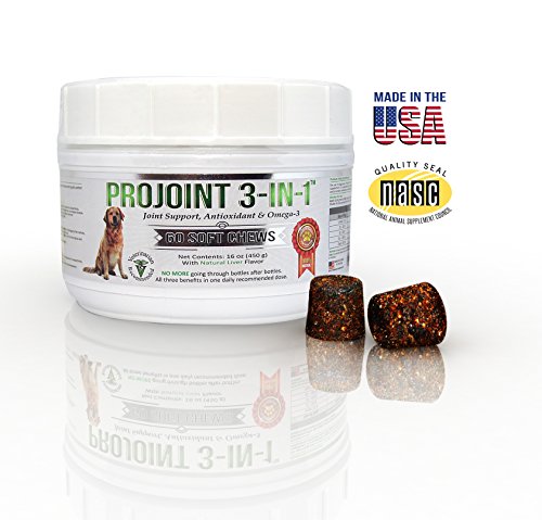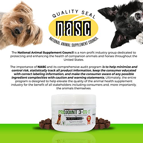 Keep your dog healthy and happy for years to come by giving him or her this tasty supplement treat daily. CLICK "ADD TO CART" now to keep your dog in great health! Will my dog like the taste of this supplement? Yes, all dogs love theses delicious supplement treats, and are excited every day when then take them! What is the NASC Quality Seal? The National Animal Supplement Council (NASC) is a non-profit group dedicated to protecting and enhancing the health of pets. NASC created the Quality Seal Program to improve and standardize the animal health supplement industry. The Seal is a way for pet owners to know whether or not they are buying pet supplements from a reputable company that has successfully passed certain quality standards outlined by NASC. Use of the Seal is a privilege for members and shows that the company has demonstrated the implementation of NASC standards. Benefits of ProJoint 3-in-1 Supplement: - Helps rebuild joint tissue and cartilage that wears out over time. - Anti-Inflammatory - Improves brain health and protects from neurological disease. - Helps build strong bones and build muscles - Helps protect against free radicals that can cause damage - Helps prevent cardiovascular disease and thyroid problems CLICK "ADD TO CART" to keep your furry friend happy and healthy for years to come! Keep your dog healthy and happy for years to come by giving him or her this tasty supplement treat daily. CLICK "ADD TO CART" now to keep your dog in great health!Feature