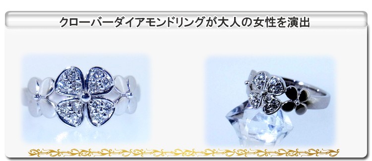 商品説明 3つの大小のクローバーの真ん中で0.2ct天然ダイヤモンドが輝くK18ホワイトゴールドのリングです。