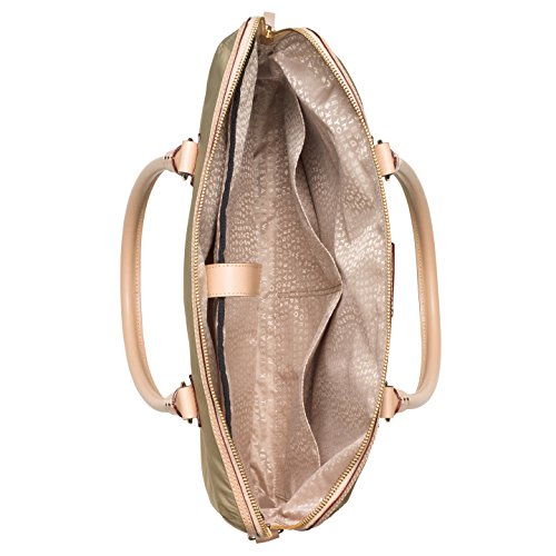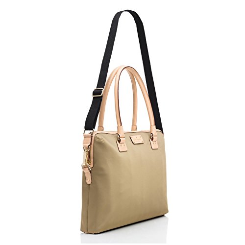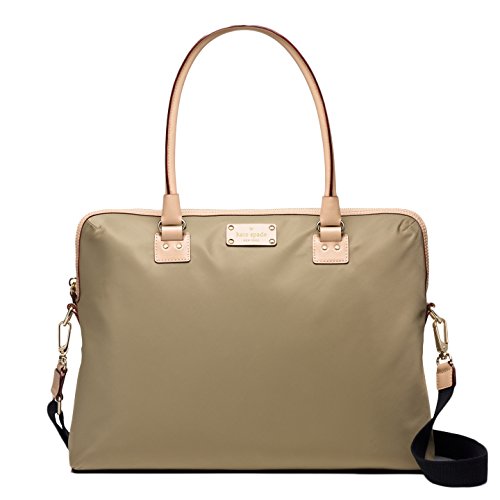 Laptop bag in nylon with vachetta split trim. fits 13" laptop. printed kate spade new york license plate shoulder straps and optional cross body strap Zip top. dual interior slide pockets and slide pocket to fit a laptop 11.7"h x 16"w x 2.3"d drop length: 7.1"