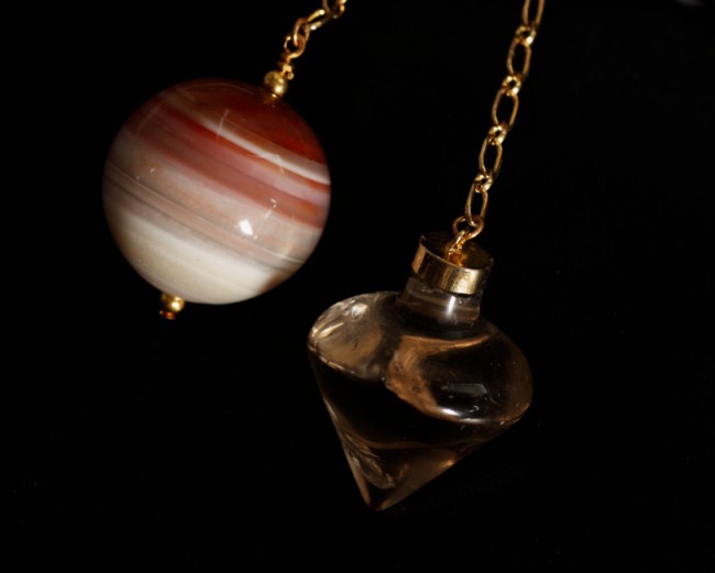 | パワーストーンの種類、カット形状、チェーン形状など様々な点にこだわりをもって制作をした1点ものダウジング用ペンデュラム。巾着ポーチ付。石が二個とも大きく重量感があります。チェーンが細いゴールド色なので、大きさの割には繊細な印象も。アゲートのしま模様が美しく、丸い形もキュートでエレガント。スモーキークォーツは天然石特有のクラックはありますが、透明感があり神秘的な美しさです。 | |