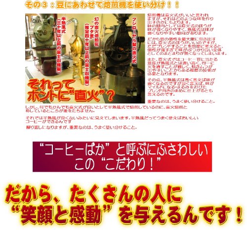 『이것으로밖에(만) 낼 수 없는 맛이 있다』와,생콩의 개성을 최대한으로 살려 버리는 모아 두고, 3종류나 되는 배 전베틀을 사용해 무승부(비기기),개성 풍부한 커피를 만들어 내는 것을 계속해 있는 배전직공(직인)「커피 바보」.그 풍일까“향기”와“단맛”서는,다른 추종을 허락하지 않는 정도의 극상의(마무리)결과.한 번 맛보면 암거래 행운에.