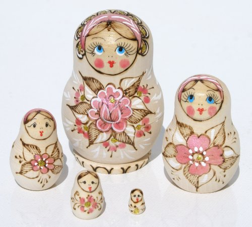 -. Feature : Woodburned and handpainted in Russia / Pink flower decor as shown on photo / Set of five dolls - smaller dolls enter inside of bigger ones / Height approx. 9-10 cm (4 inches)
