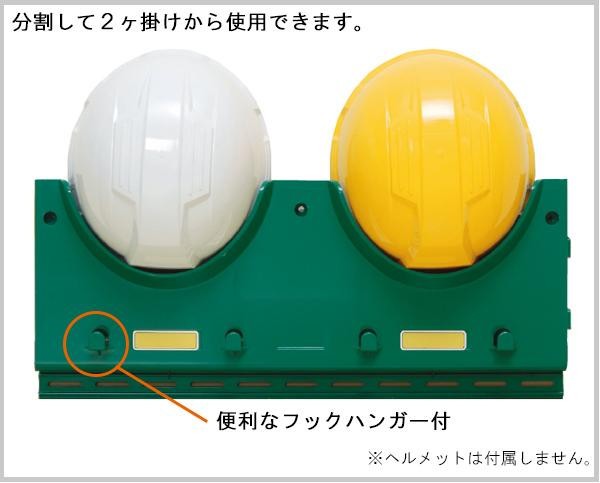 | 分割して2ヶ掛けから使用できる、便利なフックハンガー付きのヘルメットラックです。 |