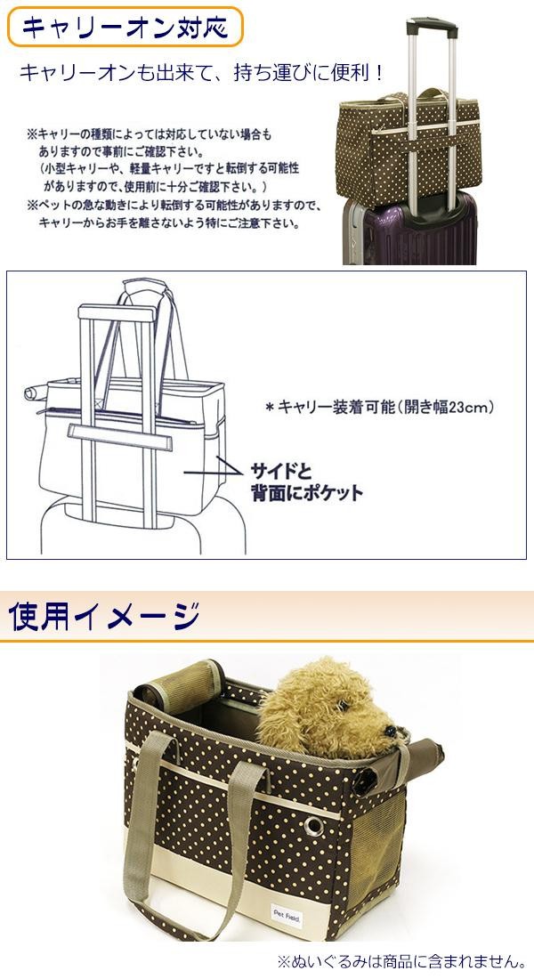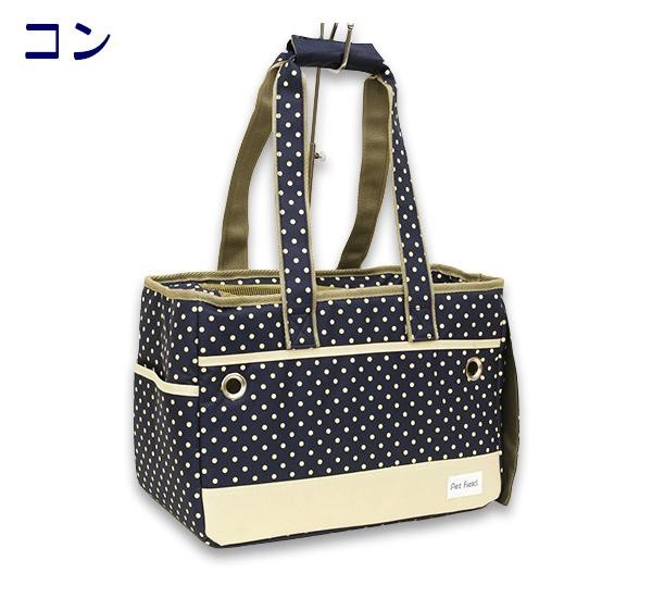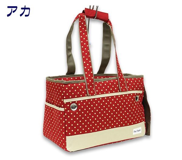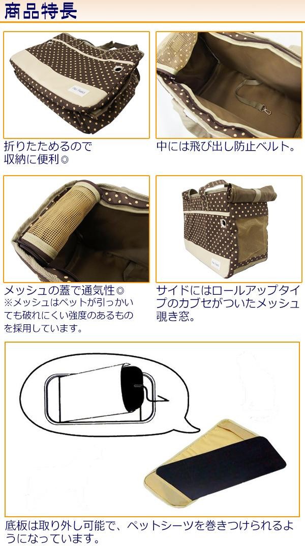 ポリエステルの生地にドット(水玉)をプリントしたペットキャリーバッグ。右サイドにはロールアップタイプのカブセがついたメッシュ覗き窓があります。内側に、首輪(カラー)につなぐ飛び出し防止ベルト付。背面にファスナーポケット、左サイドにはオープンポケット付で小物を入れるのに便利です。キャリーオンできるように、背面にベルトがついています。猫ちゃん用にもおすすめ!! |