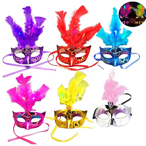 Package Including6 Pack Led Feather Mask Mardi Gras Masquerade Party Feather LED Masks (Red Pink Purple Blue Yellow Silver)