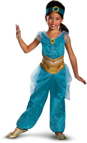 -. Binding : Toy -. Brand : Disguise -. Color : Turquoise -. Department : girls -. Feature : Includes pantsuit and headband. / Shoes are not included. / Available in kids sizes Toddler (3T-4T), Small (4-6) and Medium (7-8). / This is an officially licensed Disney Princess (TM) Costume. / Includes a turquoise harem-styled pantsuit with character cameo, and turquoise headband with turquoise stone. -. ProductGroup : Toy -. ProductTypeName : TOYS_AND_GAMES -. Title : Jasmine Sparkle Kids Costume deluxe
