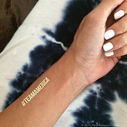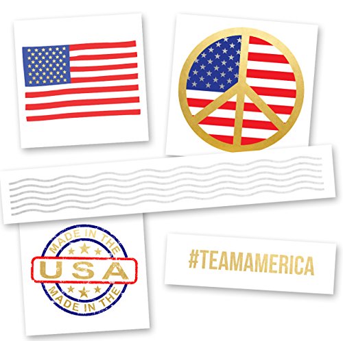 No party is complete without a little Flash! Celebrate life's special occasions with the "AMERICAN SPARKLE VARIETY PACK" party bundle, featuring 25 festive tattoos. Flash Tattoos are the perfect addition to weddings, birthdays, holiday parties, corporate events, charity fundraisers and everything in between. Use them as a fun activity for guests to apply at events, brighten up invitations or handwritten notes, a perfect party favor, promotional use on social media...the possibilities are endless! Set eight tattoos of each style: Team America-metallic gold (3" x 1"), American Pride - metallic gold/red/blue (2"x2"), Peace Love USA (2.5"x2.5"), Waves Bracelet (6"x1") and Stars & Stripes - metallic gold/red/blue (2.5"x2.5").Feature