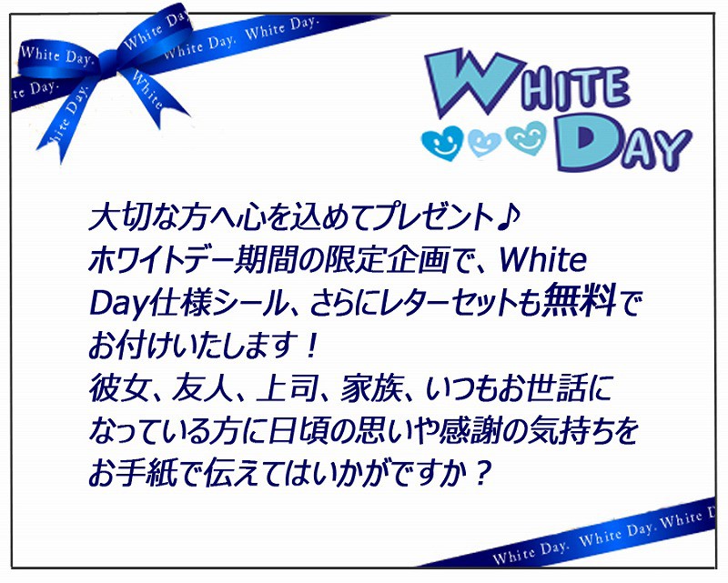 ◆ホワイトデーシール・手紙同封を無料サービスをしています。 購入時に有無の選択、手紙は備考に記入欄がございます。