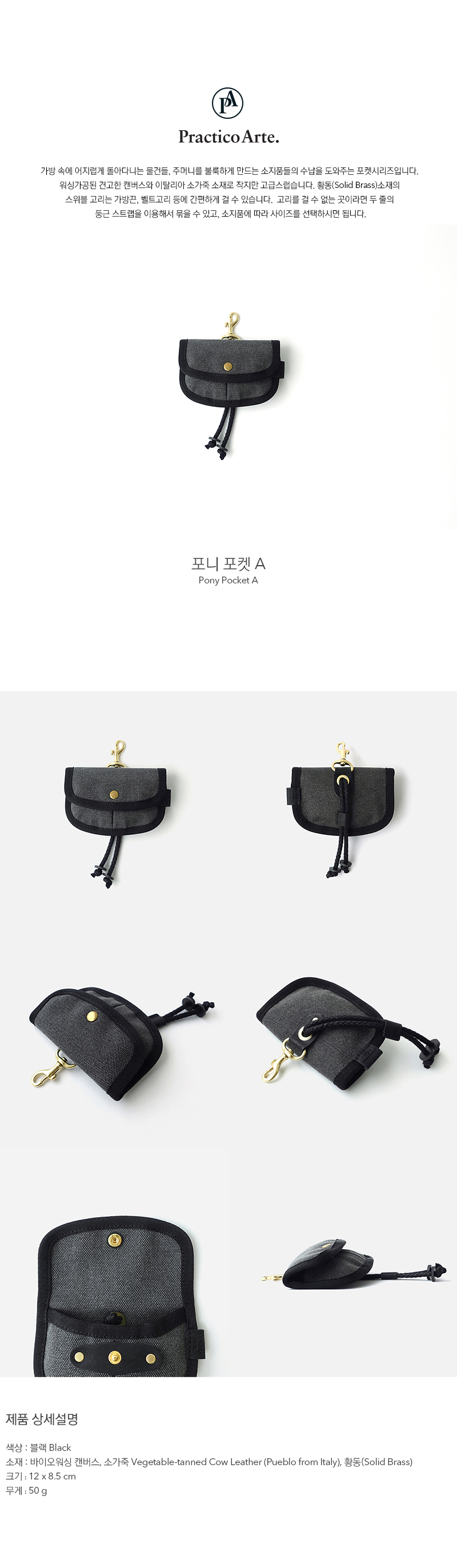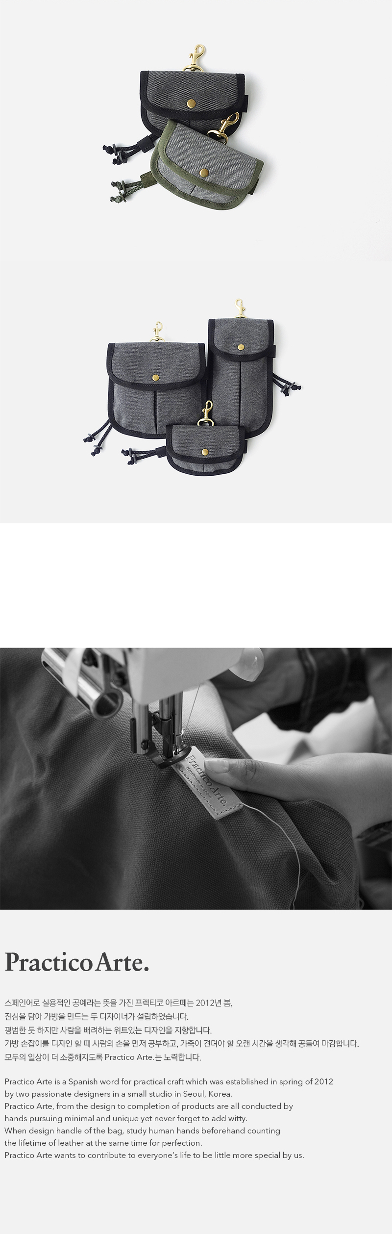 | 가방 속에 어지럽게 돌아다니는 물건들, 주머니를 불룩하게 만드는 소지품들의 수납을 도와주는 포켓시리즈입니다. 워싱가공된 견고한 캔버스와 이탈리아 소가죽 소재로 작지만 고급스럽습니다. 황동(Solid Brass)소재의 스위블 고리는 가방끈, 벨트고리 등에 간편하게 걸 수 있습니다. 고리를 걸 수 없는 곳이라면 두 줄의 둥근 스트랩을 이용해서 묶을 수 있고, 소지품에 따라 사이즈를 선택하시면 됩니다. 프렉티코 아르떼는 정성스런 수공예로 소량 생산하는 브랜드입니다. |
