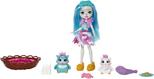 -. Feature : The Sleepover Night Owls storytelling pack is inspired by the world of Enchantimals and comes with a six-inch doll, two owl friends and accessories to play out a familiar theme / The owls' bed is shaped like a nest with a pink cushion inside and branch details outside; an open storybook inspires creativity; and three milk bottles and a plate of cookies are perfect for the trio of friends / The two owl figures -- one medium and one small - are so cute with furry hair. One has a nightcap, and the other a sleep mask / Ohana Owl doll wears a colorful outfit with a cloud P.R.Int on her removable skirt, a furry stole, yellow slippers and an eye mask / She has rooted blue hair styled long and straight and owl-like facial features to inspire wonder and storytelling