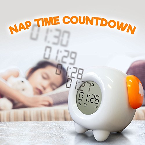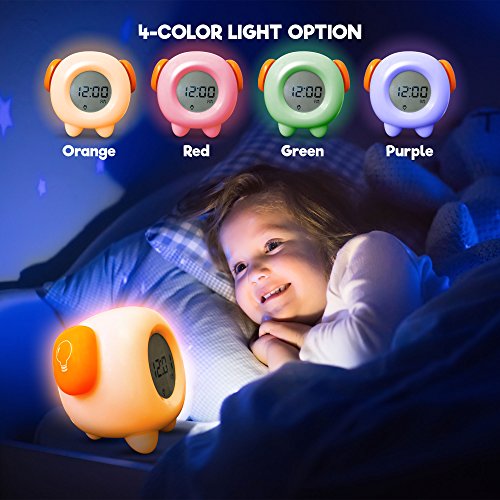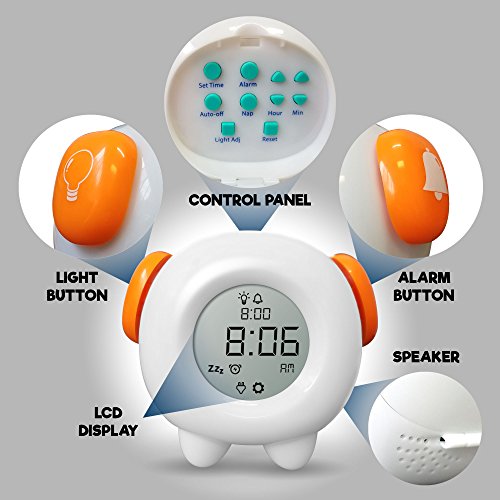 Studio : Learn Climb Publisher : Learn Climb Binding : Kitchen Product Description Teach Your Children to Stay in Bed Do you want to teach your child to stay in bed in the morning and get some extra sleep? This is a wonderful early learning aid to help teach your children when it is time to get up and for parents to get some much needed rest. The cute kiddies stay in bed clock has an amazing color changing feature and although kids may not be able to tell the time, they quickly learn that when the color changes to green, they can get up. The Greatest Invention to Help Kids Sleep The alarm clock for kids has been hailed as one of the best sleeping aids for children ever invented. Using proven teaching techniques, the soft, ambient tones of the nightlight help comfort kids and send children off into dreamland and when they wake up they normally nap until it changes green. The great, fun design gives the kiddies clock a personality that they will adore and with the easy alarm settings, it is simple to use. There's a nightlight and snooze button, even a nap time countdown and speaker. The kiddies personal clock comes with all the necessary features to help teach your kids a sleep routine so everyone gets a better night's sleep. Product Benefits Features 4 Color-changing alarm clock Soft, ambient nightlight Easy programmable alarm settings Snooze button LCD time display Nap time countdown Built-in speaker Size; 5.5 inches x 4.5 inches USB cable, included Or use 3 AA batteries, not included