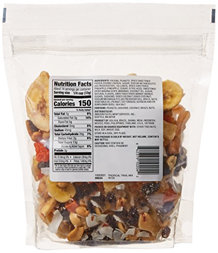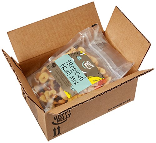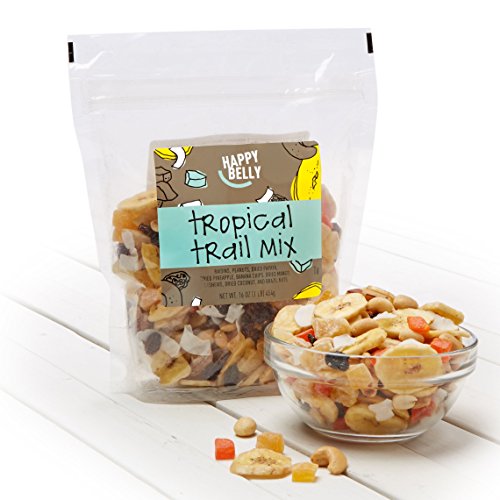 Happy Belly Tropical Trail Mix brings you a taste of the islands. We start with shelled peanuts, cashews and Brazil nuts, then add sweetened dried pineapple, papaya, and mango. Chewy black raisins, banana chips, coconut chips, and sea salt finish this chewy, crunchy, salty, and sweet blend. Enjoy this flavorful mix as an on-the-go snack for everyday adventures. A stand-up, resealable bag helps ensure maximum deliciousness all the way down to the last handful. May contain an occasional nut shell fragment.Feature