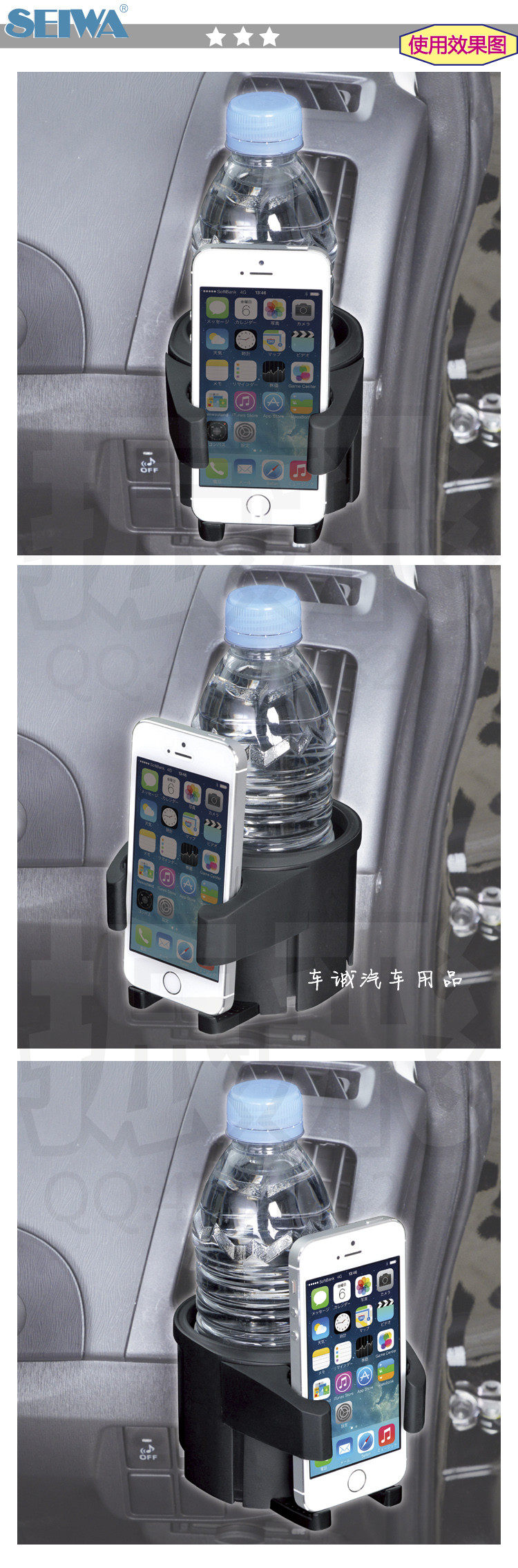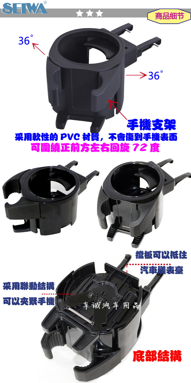 5.5CM-7.5CM diameter can be placed inside the cup and drink holder, place the phone's location can be relaxed no more than 85MM phone. Each angle adjustment can be adjusted around 36 degrees, easier to use, absolutely durable