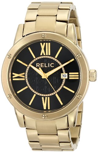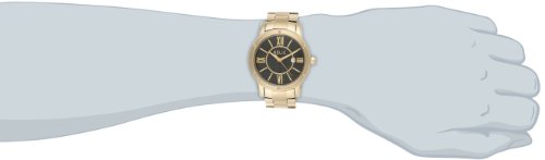 Stainless steel watch with embossed logo print on inner dial, exposed screws around bezel, and three-link bracelet