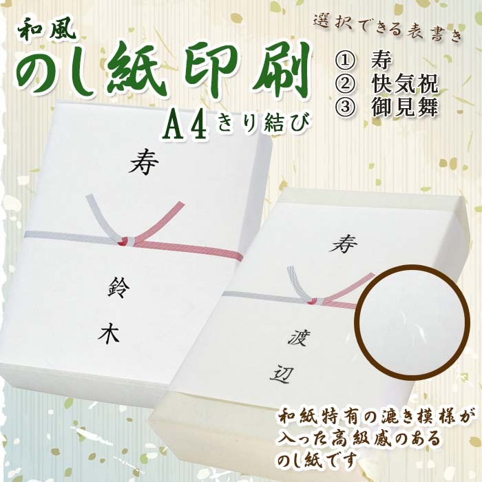 | 表書きを選んで、あなたのお名前を印刷・・・・・・ 結婚の御祝や快気祝、御見舞など繰り返さないほうが好い御祝事に利用される きり結びの のし を、独特の漉き模様が入った和紙に印刷しました。 和紙に印刷することで、品の良い高級感のあるのし紙に仕上がっております。 表書き、お名前も印刷ができるの当店の和紙のし紙 きり結び を ぜひご購入下さい! 【ゆうメール 送料無料】 <表書き> 1:寿 2:快気祝 3:御見舞 <水引> きり結び(7本) <サイズ> 縦210mm×横297mm <入数> 20枚入り <素材> 和紙 |