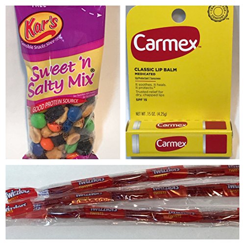 - Also includes 2.65 oz Werther's Original Creamy Caramel Filled Hard Candies, 2 oz. Kar's Sweet 'N Salty Mix, Carmex Lip Balm, A Deck of Cards (Color Will Be Either Red or Blue), a Bigelow I Love Lemon Tea Packet, and 3 Twizzlers