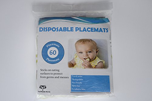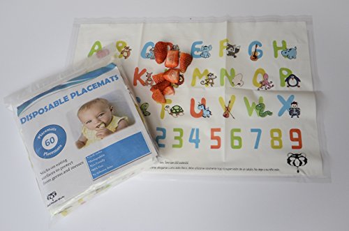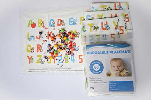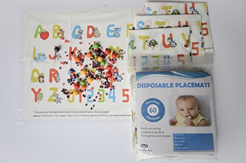 -. Feature : 60 Count - 12 x 18 inches, BPA-Free, Eco-Friendly, and Waterproof / Easy to Use and Remove: 4 Adhesive Strips peel and stick / Sticks on eating surfaces to protect from germs and messes / Educational design with ABC's and 123's / Perfect for families on the go! Can be used on any surface to eat or play.