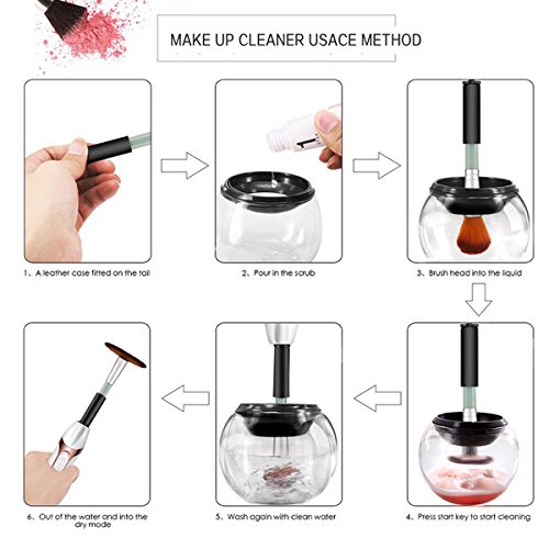 [SIMPLE AND EASY] - Just 3steps easily to use this makeup cleaner and dryer. 1. Attach the brush to the spinner. 2.Pour water and soap into the bowl. 3.Dip & spin to clean, raise & spin to dry.