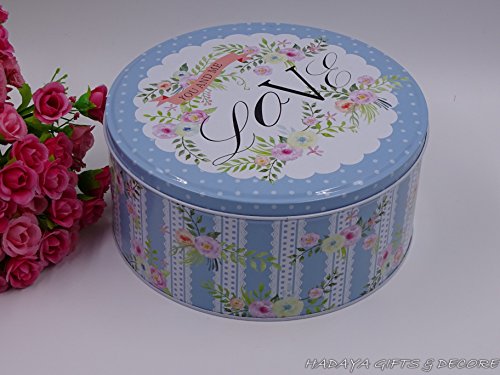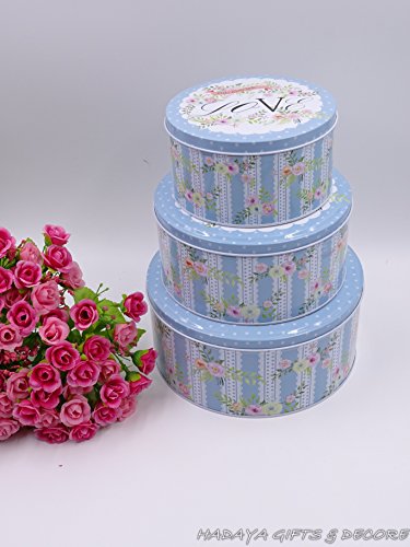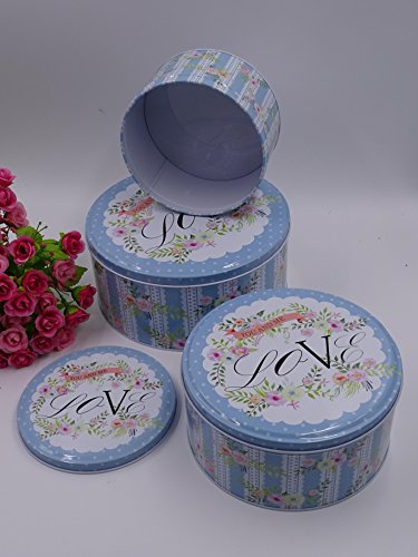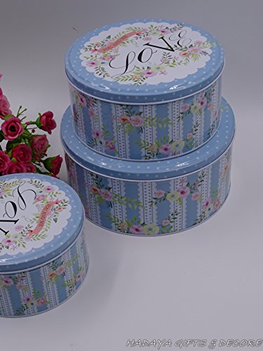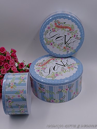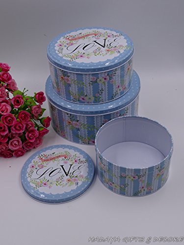 Set of 3 Loved themed blue storage tins, shabby chic, round storage tins with floral design
