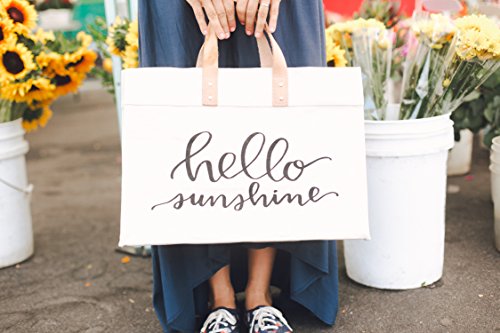 -. Brand : Adornlee -. Color : Natural -. Department : womens -. Feature : Premium 20 ounce heavy-weight cotton canvas makes it a perfect travel weekender tote / Two interior pockets for easy access to small essentials (like your keys and cell phone) / Natural canvas tote bag with hand-lettered artwork will help you stand out from the crowd / Luxurious genuine leather handles fit perfectly over the shoulder or in the crook of your elbow / 18-inches wide + 13.75-inches tall + 8.5-inch bottom gusset = roomy interior -. Model : A-1001 -. ProductGroup : Apparel -. ProductTypeName : LAGE -. Size : Extra Large -. Title : Canvas Travel Weekender Tote with Quote - Leather Handle, Large, 100% Cotton, Hello Sunshine