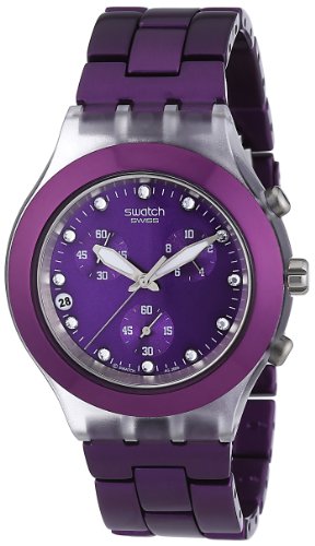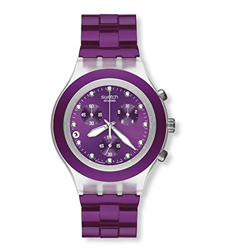 Studio : Sweet Baby Ray's ReleaseDate : 2012-04-05 Publisher : Sweet Baby Ray's Binding : Watch Product Description SVCK4048AG by Swatch is truly one of a kind. The luminous hour and minute hands stand out and are easily read in daylight or in the dark. The watch's attractive purple dial is surrounded by a plastic case for added contrast, and is protected by a plastic crystal. Other features include a bracelet that closes with a buckle clasp and measures seconds. This watch is water resistant to 30m and boasts reliable swiss-quartz movement. 0