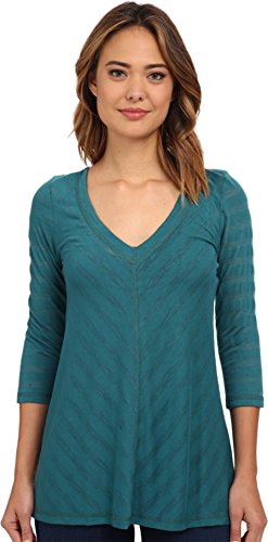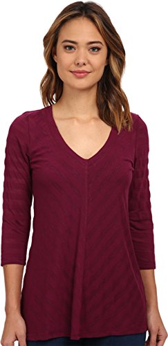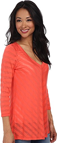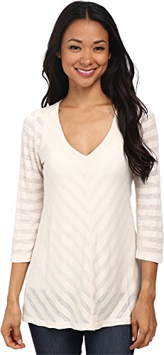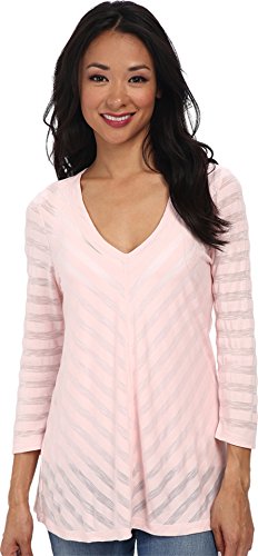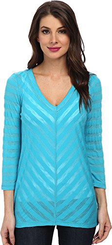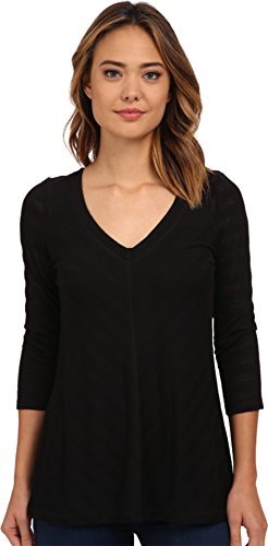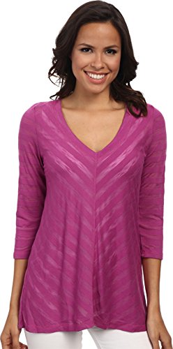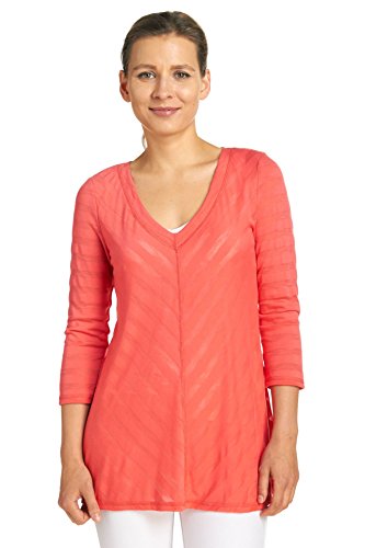 Burnout knit top features mitered stripes. Body-shaping inner shell provides a slim and smooth silhouette. V-neckline. Front and back center seam. Hemmed cuff on the three-quarter sleeves. Falls below the hips. Carefully constructed to prevent the tank liner from rolling or riding up the torso. Layers are attached at the shoulder seams and back collar. 53% rayon, 47% polyester;Feature