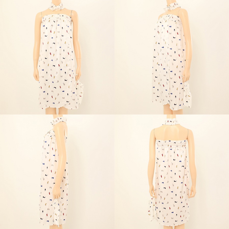 깔끔한 화이트 바닥 위에 귀엽고 알록달록한 고양이 나염이 올라간 골프가운 입니다.