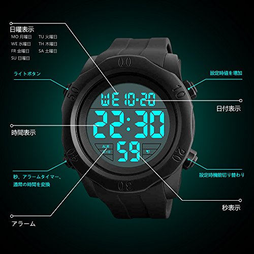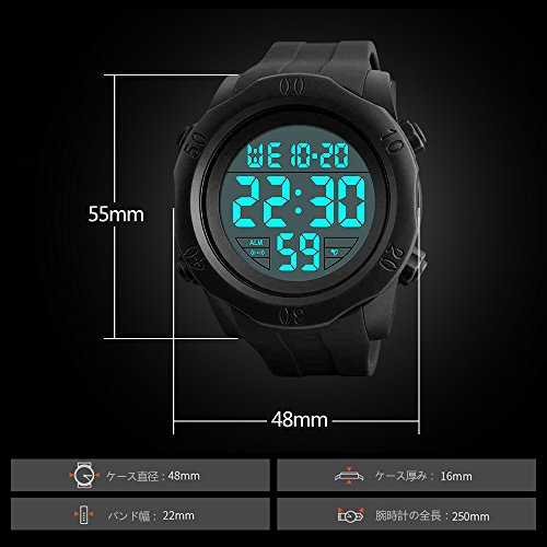 -. Feature : ケース厚み:16mm バンド幅:22mmバンドの長さ:250mm 約重量:66g。 簡単な日本語取扱説明書付き。 / デジタル表示、日付曜日表示、30M防水、12/24時間制切替、アラーム機能、夜光機能、 30M防水、気楽で水上運動ができます。ただ、注意すべきのは水で使う時全部のボタンを押しないで下さい。 / シンプルで、耐久性に優れたデザインでアウトドアやスポーツにはもちろん、 日常生活にもお使い頂けます。 デザイン性もだけでなく、防水機能、 アラームやストップウォッチなど機能面での充実も実現しております。 シンプルで文字盤が大き目の存在感のある時計です。 デジタル表示&大きいデジタル文字盤で時間を分かりやすいです。 / 風防材料は強化ガラスを使い、鏡は高品質合成樹脂素材採用、耐久性に優れています。 バンドはシリコーン素材、ケースはABS素材採用、耐久性、耐磨耗性に優れています。 / ※30日以内返品/返金/交換サービスを提供いたします。※ご購入日から30日以内返品/交換/返金が可能です。ぜひお気軽にお問い合わせ下さい。