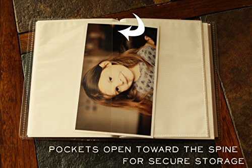 THE DURABLE POCKETS keep photos or other memorabilia secure - opening is on interior 6" edge towards the spine. Each page holds a single photo with a white background.