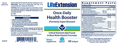 Life Extension's Once-Daily Health Booster (formerly known as Super Booster) is a cost-effective formula that combines a variety of valuable nutrients in one softgel. Health Booster contains many critical nutrients missing from most multivitamin formulas in a convenient daily softgel, designed to complement the Life Extension Mix or One/Two-Per-Day formulas.Feature