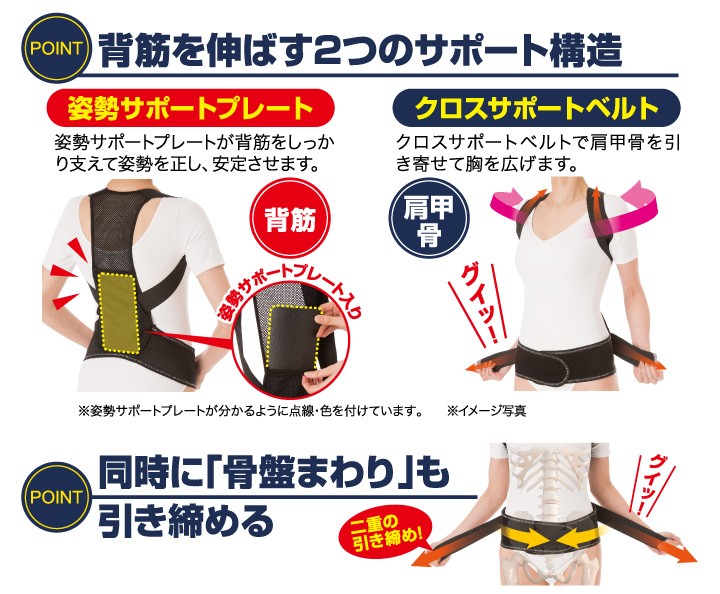 | ご使用方法 | ※着用位置の目安は裏面表記にあります <サイズの選び方>の写真を参考にしてください。 ※下着・衣類の上に着用してください。 ※洗濯タグがある方を内側にして装着してください。 1.着用前にクロスサポートベルトが上写真のように本体内部に通っていることを確認してください。 2.肩側のベルトを両肩に通してください。次に腰側のベルトを腰の位置にあわせ、面ファスナーでとめます。 3.クロスサポートベルトの持ち手部分を本体からはがし、左右に引っ張ります。締め付け加減を調節して、本体にとめます。 4.装着完了。締め付け感がゆるい、またはきついと感じる場合は、再度クロスサポートベルトで調節してください |