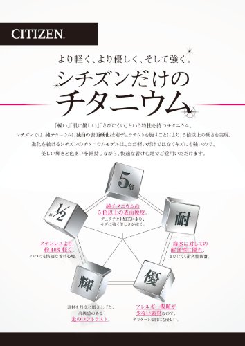 -. Feature : セット内容:本体、ボックス、取扱説明書、保証書同梱 / 日常生活用強化防水:10BAR / 原産国:日本 / ケース素材:チタン、精度: ±15秒/月(非受信時)、機能:10気圧防水、光発電:フル充電時約2年間駆動、パワーセーブ、パーペチュアルカレンダー、時差設定機能、99%クラリティーコーティング、耐ニッケル、耐磁1種、デュラテクトTIC、曜日日付表示、ジャイロフィット、フィットアジャスター