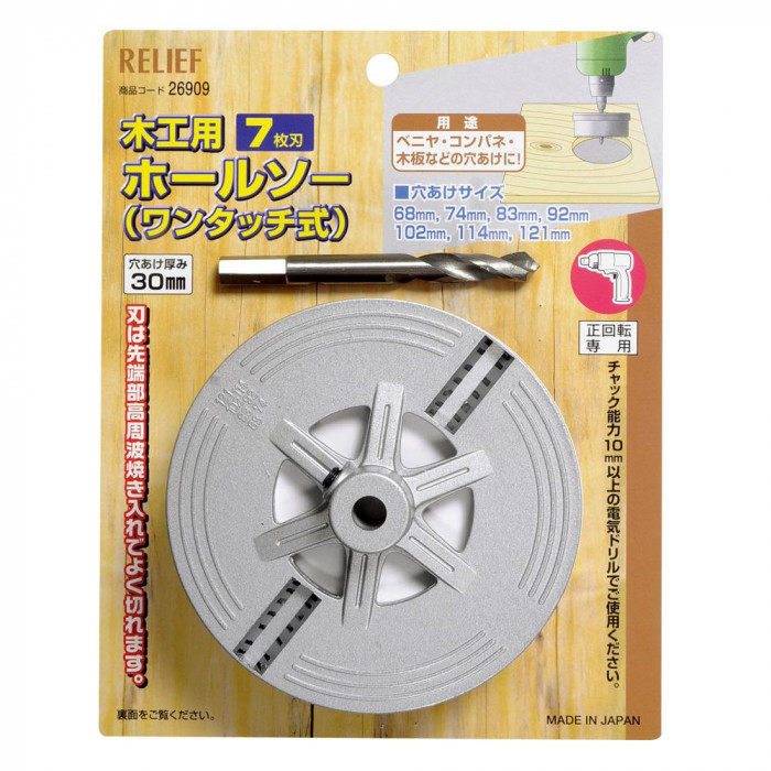 fk094igrjs刃は先端部高周波焼き入れなのでよく切れます サイズ 個装サイズ:23×19×6cm 重量 個装重量:672g 素材・材質 ドリル刃/S45C 仕様 7枚刃 ワンタッチ式 正回転専用 刃の巾:40mm 穴あけ厚み:30mm 【適正回転数】 68mm、74mm、83mm:500回転 92mm、102mm:300回転 114mm、121mm:300回転以下 製造国 日本 ベニヤ、コンパネ、木板などの穴あけに 刃は先端部高周波焼き入れなのでよく切れます