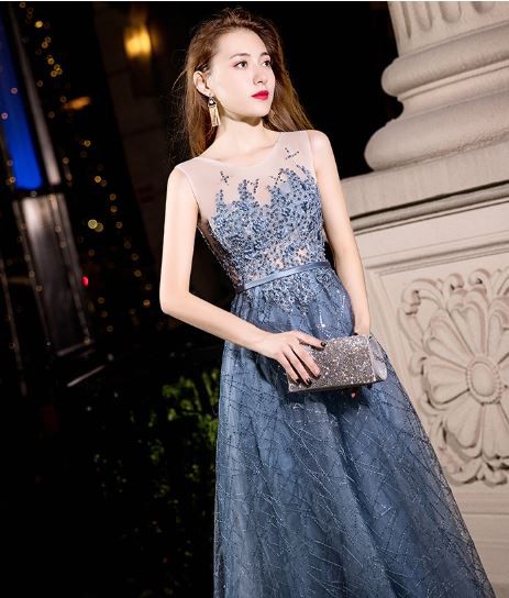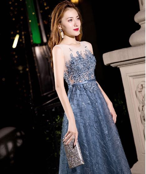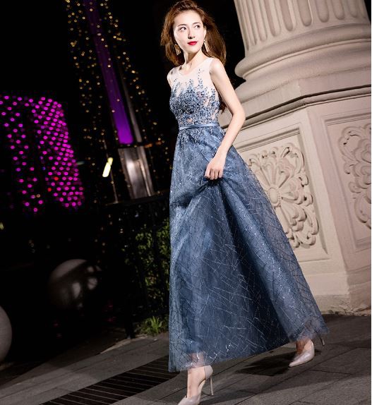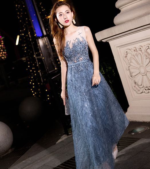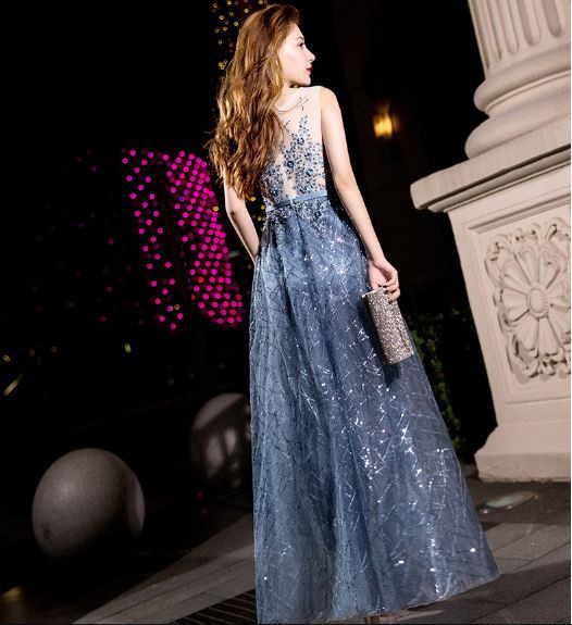 キラキラのビジューやスパンコールが華やかなロングドレスです。