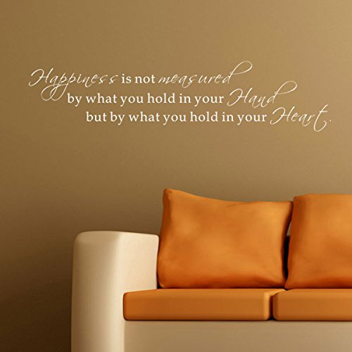 ReleaseDate : 2015-10-25 Studio : Pop Decors Publisher : Pop Decors Binding : Baby Product Product Description High quality wall art product by Pop Decors, creates hand painted look on your wall. Free squeegee. SIZE: 47"W Color: White The text says: Happiness is not measured by what you hold in your Hand but by what you hold in your Heart. Decals can be applied on smooth and clean surface (walls, glass, doors etc. . ). Not recommended for textured walls (orange, sandy and grainy), fresh paint (less than 14 days) or low VOC (Volatile organic compound) paint. Original designs by Pop decors. 2010 Copyrights Protected. . 0