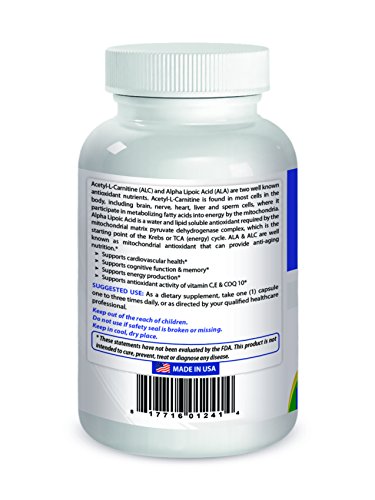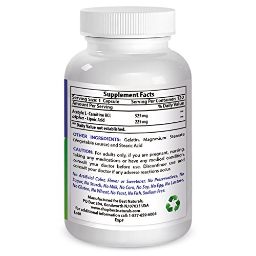-. Feature : Best Naturals ALA/ALC - Best Naturals Acetyl L-Carnitine & Alpha Lipioc Acid are vital nutrient for cellular vitality / Supports vital metabolic function, Supports immune system & healthy liver function* / Support cardiovascular & cognitive health* / No Artificial Color, Flavor or Sweetener, No Preservatives, No Sugar, No Starch, No Corn, No Soy, No Egg, No Lactose, No Gluten, No Wheat, No Yeast, No Fish, No Sodium. / TOP QUALITY GMP CERTIFIED PRODUCTS - All Best Naturals products are manufactured in accordance with Good Manufacturing Practices (GMP), among the highest standards in the world -- Proudly Made in USA -- Purity & Potency Guaranteed