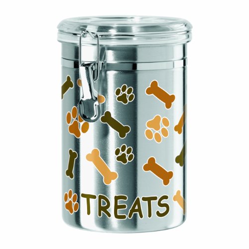 Oggi Airtight Stainless Steel 51-Ounce Pet Treat Canister with Treats, Paws and Bones Motif-Clear Acrylic Flip-Top Lid with Locking Clamp Closure