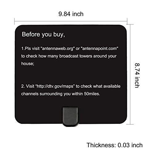 50 MILE LONG RANGE -- Before you buy, please visit "antennaweb.org" or "antennapoint.com" check how many broadcast towers; visit “http://dtv.gov/maps” what available channels surrounding you within 50miles. Channel reception may vary depending on what's broadcasting in your area, distance from broadcast towers, terrain and the surroundings. Generally, the antenna should be kept far from disturbance source, big electrical appliances like cooling machine, lift, blower or microwave oven etc.