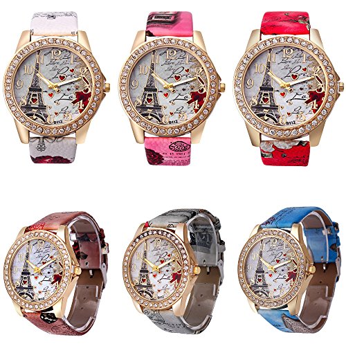 -. Title : CdyBox Women Lady Eiffel Tower Pattern Leather Band Assorted Rhinestone Dress Watches (6 Pack)