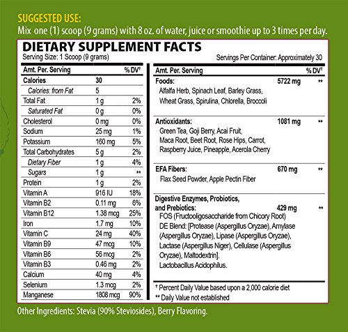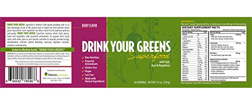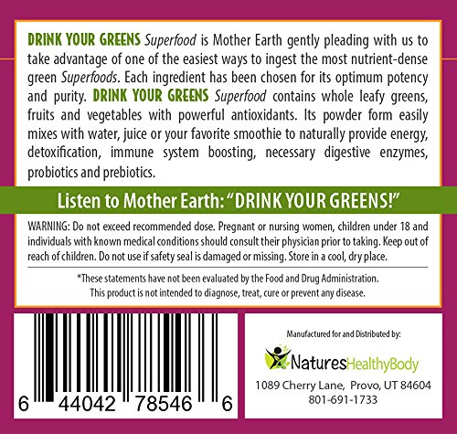 DRINK YOUR GREENS Superfood is Mother Earth’s answer to “Eat your vegetables!” in an easy to ingest, easily absorbed, nutrient-dense concentrated powder of 19 of the highest quality green Superfoods, digestive enzymes, probiotics and prebiotics!